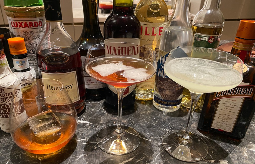 I have stayed as true to this 1871 classic as I can 150-years latter. Hennessy Cognac (c1765) would have been available in 1871, as would Luxardo Maraschino (c1821), and they form the 50-50 base of this wine-glass cocktail. Unfortunately the very popular and readily available in 1871 Boker’s Bitters (sometimes mistakenly but now historically mis-named ‘Bogart’s Bitters’) did not survive the US Prohibition era (1920 to 1933). Some have tried to ‘remake’ this classic Bitters. The best, researching and tasting original samples to create what is said to be a faithful reformulation, is Dr Adam Elmegirab’s Boker’s Bitters, more information here. I plan on giving their Bitters a try in some classic cocktail remakes.