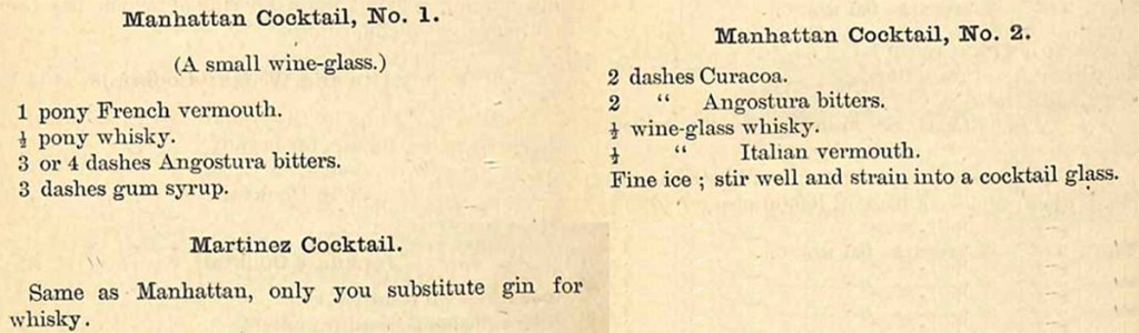 Slightly later, for example in Jerry Thomas’ 1887 Bartender’s Guide, the Manhattan recipe (and presumably therefore the Martinez), has shifted to include Curacao OR Maraschino, and also a preference, common in the USA at the time, to use Boker’s Bitters which had more orange notes than Angostura. Boker’s Bitters did not survive the Prohibition era in the US (1920-1933) and most more contemporary recipes use ‘Orange Bitters’.