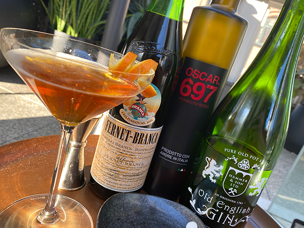 METHOD — Add 45ml Gin (Hammer & Son, Old English Gin or an Old Tom variety), 45ml sweet red Italian vermouth (I suggest Oscar 697 Rosso), and 5-to-10ml of Fernet Branca (to personal taste) into a cocktail shaker. There is no substituting the Fernet Branca, it isn’t a ‘Hanky Panky’ without it. Shake with a handful of ice until cold (10-15 seconds) and strain into a chilled Martini glass. Garnish with an Orange Twist and float some orange zest oil on the surface of the cocktail.