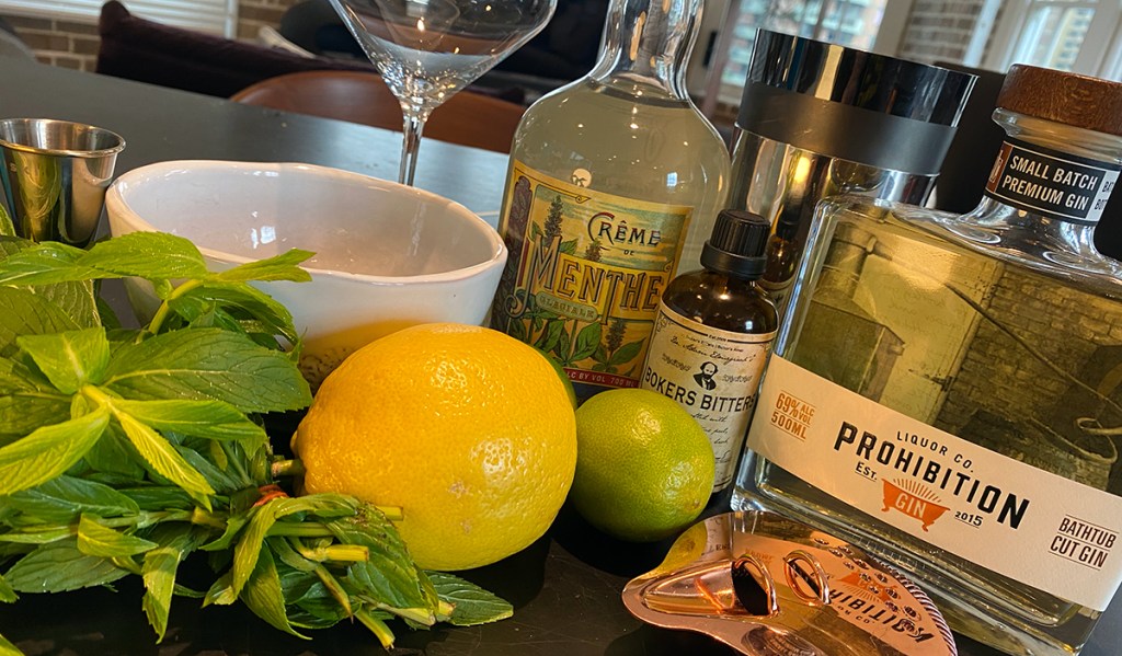 The homage to Prohibition and the roaring-twenties, is the use of the Prohibition Liquor Co.’s – Bathtub Cut Gin (very juniper strong and at a whopping 69% alcohol content). As well as using Dr. Adam Elmegirab’s Bokers Bitters, a reproduction of the dominant US Bitters of the day, the original version of which did not survive the Prohibition era. For some attempt at improving the flavour profile, I have gone with a half-half lemon and lime, some mint infused sugar syrup and finally good quality Créme de Menthe. I am happy with the end result, it just isn’t the best canvas to begin with.