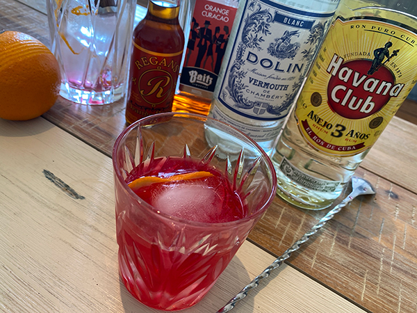 METHOD – Add 45ml White Cuban Rum (Havana Club or Bacardi), 45ml Dolin Blanc Vermouth (Vermouth de Chembéry – really must be this specific Vermouth, see details here), 10ml Orange Curacao (or Red Curacao if you can source it), 5ml Grenadine Syrup (a barspoon or less – for colour only), and 4-to-6 dashes of Regans’ Orange Bitters No.6 (or Angostura Orange Bitters – orange only), and some additional fresh orange zest if desired into a mixing glass with ice. Stir well and then strain into a Coupe or into a Double Rocks over a large cube or sphere of ice. Garnish with some Orange Peel.