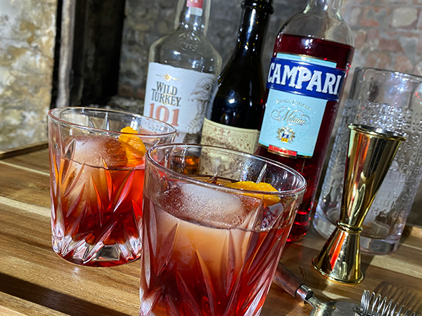 METHOD – Add 30ml quality Bourbon, 30ml Italian Sweet Red Vermouth, and 30ml Campari Bitters into a mixing glass with a handful of ice or a couple of large ice pieces. Mix well until cold (10 seconds or so) and strain into a double rocks glass containing a large cube or sphere of ice. Garnish with some orange peel, squeezing some of the zest oil onto the cocktail surface.