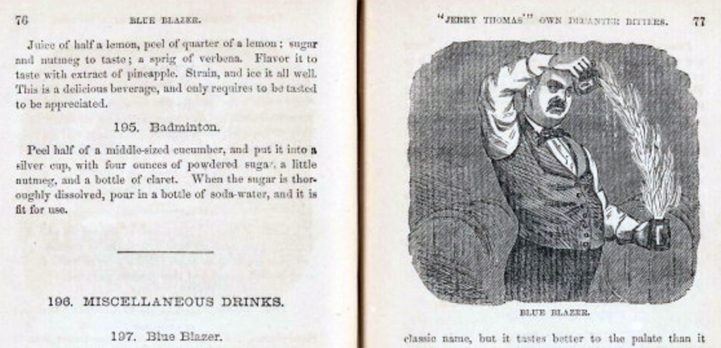 HISTORICAL NOTES – Most likely invented by Jerry (‘the Professor’) Thomas (1830–1885), while working at the El Dorado gambling saloon in San Francisco, sometime before 1860 during California’s Gold Rush (1848–1855). The ‘Blue Blazer’ is suspected of being the original ‘flaming cocktail’. The recipe appears in his 1862 book titled the ‘Bar-Tender’s Guide’ and also ‘How to Mix Drinks: The Bon Vivant’s Companion’, the first drink recipe book published in the United States.