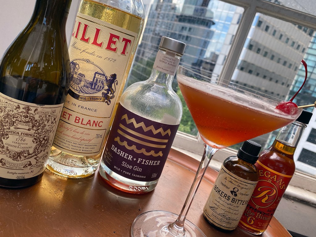 METHOD – Add 30ml Sloe Gin (Plymouth Sloe style, I suggest Dasher & Fisher from Tasmania, Australia), 30ml Lillet Blanc (French Vermouth), 30ml Carpano Antica (Italian Red Vermouth) and 3-dashes each of Regans’ Orange Bitters No.6 and Bokers Replica Bitters (or similar Cardamon Bitters) into a cocktail shaker with a handful of ice. Shake until cold (10-15 seconds) and strain into a chilled coupe, martini or cocktail glass.