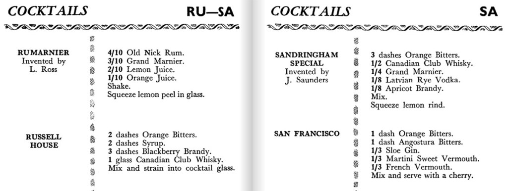 HISTORICAL NOTES – First appearing in William J. Tarling’s 1937 ‘Café Royal Cocktail Book: Coronation Edition’, the recipe is a three-part Sloe Gin, Sweet Vermouth and Dry Vermouth combination. Very different to the more recent Vodka, Crème de Banane, orange juice, pineapple juice and grenadine mix, which just isn’t a quality cocktail.